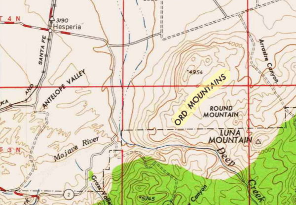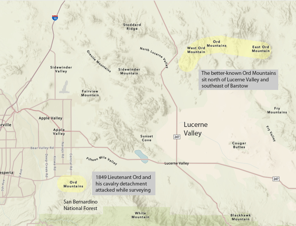 - A second, lesser-known Ord Mountains name shows up southwest of Lucerne Valley, closer to Hesperia and Apple Valley. This separate range appears to have been named after an incident in 1849, when Lieutenant Ord and his cavalry detachment were attacked while surveying in that area. Contemporary reports described the soldiers being “surrounded and mauled” by Native Americans. Later mapmakers and local usage extended Ord’s name to those hills as well, even though they are distinct from the main Ord Mountains to the north.