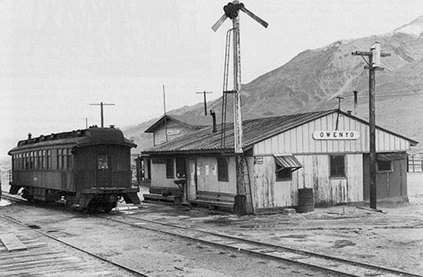 Owenyo, CA![]() Photo - OwensValleyHistory.com Owenyo’s story makes more sense when you see it as part of a much bigger railroad picture. It was never meant to stand alone. It was a piece in the puzzle of how the Owens Valley connected to the outside world, caught between an old narrow-gauge line that wandered the desert and a new standard-gauge branch that pulled it into the wider Southern Pacific system. The narrow-gauge came first. The Carson & Colorado Railroad was built in the 1880s to reach remote mining camps and settlements along the eastern Sierra. It was a shoestring line, built light and cheap, with rails barely three feet apart. By 1900, Southern Pacific had taken it over, but it still struggled to earn its keep. When the company decided to push a standard-gauge line north from Mojave into Owens Valley, it needed a meeting point between the old and the new. That meeting point became Owenyo. In 1908, the Jawbone Branch reached Owenyo. From that moment on, the little town was the gateway. Narrow-gauge cars from the north rolled in from Keeler, while standard-gauge cars arrived from the south. Owenyo was where the loads were shifted: bags of produce, ore, timber, livestock, barrels of fuel. For half a century, this transfer gave Owenyo life. It was dusty, noisy, and hard work, but it tied the valley to markets far beyond the Sierra. Owenyo’s role faded as trucks took over in the 1950s. Highways could carry goods faster and more directly, without the awkward dance of transferring loads between mismatched rails. By 1960, when Southern Pacific finally abandoned the narrow-gauge line to Keeler, Owenyo’s reason for being was gone. The Jawbone Branch itself lingered, mainly serving the aqueduct project and later the Lone Pine area, but without the interchange, Owenyo was finished. Today, Owenyo is just a memory in the desert, a reminder of how railroads once shaped whole towns and how quickly those towns could vanish when the rails moved on. Timeline of Owenyo in the larger desert rail network: 1880s – Carson & Colorado narrow-gauge built, running south into Owens Valley. 1905 – Owenyo founded as the designated transfer point for freight, northeast of Lone Pine. 1908 – Southern Pacific’s Jawbone Branch (standard gauge) completed from Mojave to Owenyo, linking the valley to the main rail system. 1910s–1940s – Owenyo thrives as the interchange hub between narrow and standard gauge. 1950s – Trucking grows; freight bypasses the rail transfer at Owenyo. 1960 – Narrow-gauge from Owenyo to Keeler abandoned, ending Owenyo’s purpose. Post-1960 – Owenyo abandoned; only foundations and rail remnants remain. |