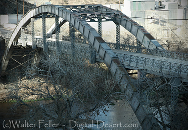Bridges of the Mojave River Narrows — A Unified HistoryThe Mojave River Narrows has long been one of the most consequential crossing points in the Mojave Desert. Here, the Mojave River—usually dry, occasionally violent—compresses into a narrow corridor that has dictated travel routes since well before American settlement. Trails, railroads, and highways all converged at this point, and each generation was forced to confront the same problem: how to cross a river that is calm for years, then destructive in hours.Early Trails and FordsBy the mid-1800s, the Narrows served travelers on the Old Spanish Trail and the Mormon Road. Crossings were simple fords—unreliable at best. Seasonal runoff and sudden floods frequently stranded wagons and livestock, making the Narrows both essential and dangerous.The 1889–1890 Bridge DebateIn 1889, the San Bernardino County Board of Supervisors finally committed to building a bridge. The decision ignited a bitter public debate over location:Lower Narrows: between Victorville (then Victor) and Oro Grande Upper Narrows: between Victor and what would later become Apple Valley Newspapers warned against the Upper Narrows site. A February 25, 1890, Daily Courier editorial went so far as to say that building only one bridge there would be “more criminal still.” The warning was ignored. The Upper Narrows was chosen. The First Metal Bridge and Its Collapse (1890)The bridge built at the Upper Narrows was a metal suspension bridge, intended to solve the failures of earlier wooden spans. As completion neared, civil engineer A. H. Koebig warned that it would not meet the contract requirement of 1,250 pounds per lineal foot.To silence critics, the county staged a live load test on September 26, 1890. Under light rain and before a large crowd, a rock-loaded wagon pulled by six mules crossed successfully. It crossed again, now coupled to a second loaded wagon. As the two wagons waited on the east side, a third entered the bridge. Before it reached them, a suspension-cable support failed. With a roar “like a clap of thunder,” the anchorage collapsed, dropping men, wagons, mules, and stone 50 feet to the riverbed below. Miraculously, all six people survived. A young boy, Austin Ellis, suffered a leg broken in three places and displayed the stoicism long associated with desert life. Contemporary reports conflict on whether the mules survived; eyewitnesses later confirmed they did not. Newspapers dubbed the event “The Victor Horror.” Rebuilding and FireDespite public outrage, the bridge was rebuilt in 1891 by Phelps Manufacturing Company of San Francisco. This second-generation bridge served for about a decade. In 1901, its wooden roadway caught fire—almost certainly from a passing train—destroying the deck but leaving the main structure intact. Repairs were made, and the crossing continued in use.Steel, Railroads, and PermanenceBy the early twentieth century, steel technology improved bridge longevity. A steel truss bridge completed in 1916 marked a turning point, accommodating automobiles and stabilizing regional travel. Meanwhile, the Atchison, Topeka and Santa Fe Railway expanded through the Narrows, adding multiple tracks by the 1920s and cementing the area’s role as a transportation corridor.The Rainbow Bridge (1928–1963)In 1928, the third Victor Bridge was replaced by the graceful Rainbow Bridge, named for its arched profile. For decades it carried highway traffic and became a local landmark, overlooking a stretch of river that alternated between dry sand and flowing water. It remains standing today beside Highway 18, no longer in use but preserved as a visible reminder of earlier engineering.Modern CrossingsIn 1963, a new concrete bridge replaced the Rainbow Bridge as the primary Upper Narrows crossing. Designed to withstand floods and heavy traffic, it reflects the hard lessons learned from seventy years of failure, rebuilding, fire, and collapse. Today, Highway 18 continues to link Victorville and Apple Valley across the Narrows, while Route 66 lies just beyond Old Town Victorville.LegacyThe bridges of the Mojave River Narrows are clear evidence of persistence earned the old way—by trial, error, and respect for the land. From fords to failed suspension cables, from fire-damaged decks to steel and concrete spans, each bridge was shaped by what came before it. The Mojave River never changed its nature; the builders did.TimelineLate 1890 Public outrage and newspaper condemnation follow. Two supervisors vote to permit reconstruction.1891Second-generation Victor Bridge completed by Phelps Manufacturing Company of San Francisco.1901Wooden roadway deck burns, likely from a passing train. Main structure survives; repairs completed for less than $4,000.1916Steel truss bridge constructed, reflecting advances in engineering and the rise of automobile traffic. Strengthens regional travel centered on Victorville.1920sRail infrastructure expands through the Narrows; a second track is laid by 1924.1928The steel truss bridge is replaced by the arched Rainbow Bridge, named for its bow-shaped profile.1928–1963Rainbow Bridge carries highway traffic at the Upper Narrows.1963Modern concrete Upper Mojave Narrows Bridge replaces the Rainbow Bridge as the primary crossing. The Rainbow Bridge remains standing beside Highway 18, closed to traffic.PresentThe Highway 18 bridge continues to connect Victorville and Apple Valley.Earlier bridges remain as physical evidence of more than a century of adaptation to the Mojave River’s behavior. |