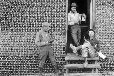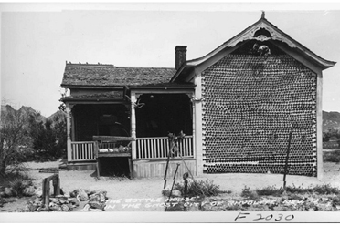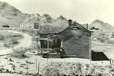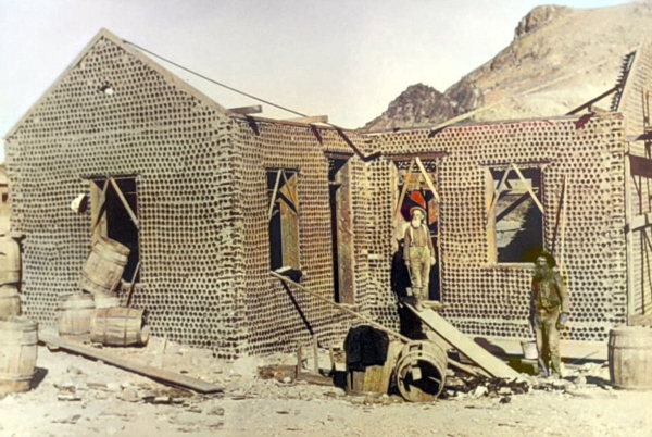 Tom Kelly's Bottle House![]() 2001 The Tom Kelly Bottle House is one of the few remaining examples of bottle house architecture in the United States. In Nevada, where wood is scarce and expensive, miners often built their houses with whatever was cheap and readily available. In many cases, glass bottles fit the bill. The bottles would be used like bricks and mortared in with adobe. Bottle houses are great in hot climates because they are cool in the summer, hold heat in the winter, and allow for natural light. This bottle house was built in 1906 by Tom Kelly, an Australian-born stonemason turned gold miner, using over 50,000 bottles. Kelly paid local children 10 cents for a wheelbarrow full of bottles - about $3 in 2021. The building cost about $2,500, with most of the money going for wood trim and fixtures. ![]() 1906 Instead of living in the house, Kelly decided to auction it off. He sold 400 tickets at $5 apiece, losing about $500 on the deal. The raffle was won by the Bennett family who lived in the house from 1906 to 1914. In 1907, The Bennetts hired Dave Kinney, a ship-wright by trade, to build the porch roof and add the false chimney and gingerbread trim. The bottle house's unique location and appearance made it a sought-after filming location. In 1924, Paramount Pictures used it in the film Wanderers in the Wasteland, based off a Zane Grey novel. Later that same year, the house was also used in the film The Air Mail. During that time, one of the film crews tore down the rear wall so filming could take place inside the building. After wrapping up, the production company rebuilt the wall and did basic stabilization and restoration work on the exterior. BLM interpretive panel |