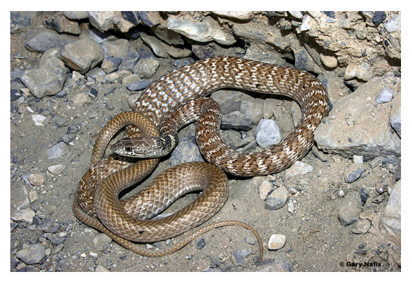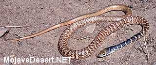 ![]() ![]() Coachwhip Photo by Chris Brown ![]() Coachwhip Photo by Chris Brown Additional information: Scientific name: Masticophis flagellum piceus Common name: Red Coachwhip or Red Racer Size: 24.4-54.3 in (62-138 cm) Distinguishing characters: A species with highly variable dorsal coloration; tan, grey, red, or pink with bold black or brown crossbars or blotches on neck which may blend together; venter pink; slender body and tail; large eyes with round pupils; often described as a red snake with a black head. Juveniles: Black, brown or tan transverse bands on lighter background; black neck markings absent in hatchlings and faint in juveniles less than 24 in (61 cm) in length. Dimorphism: None Similar species: Masticophis lateralis: Has distinct yellow lateral stripes. Additional notes: A fast moving diurnal snake that is difficult to capture. Bites, excretes musk and twists body when handled. Large individuals should be handled with caution. The fastest snake in the Mojave, it moves about during the day in search of grasshoppers, lizards and small rodents. When threatened, it imitates a rattlesnake by curling into a striking position and vibrating its tail. |