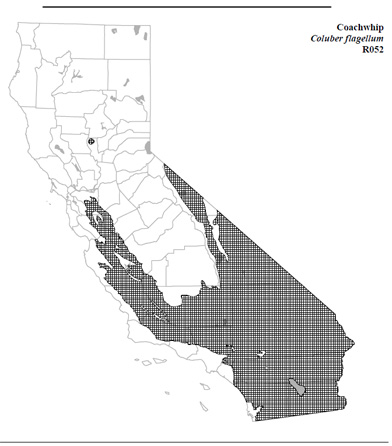 Also see: Joshua Tree National Park Wildlife Red Coachwhip Masticophis flagellum piceus Prefers open areas with high visibility (common) California Striped Racer Masticophis lateralis lateralis ... Death Valley Snakes Western Coachwhip (Red Racer) Masticophis flagellum piceus Common throughout park; often seen crossing roads; very fast and heat-tolerant; an agressive snake ... Ash Meadows Coachwhip and gopher snakes are two of the more common snakes seen at Ash Meadows. During the heat of mid-summer, many reptiles and amphibians become ... Source: CDFW California Wildlife Habitat Relationships. Accessed [N/A] https://wildlife.ca.gov/Data/CWHR |